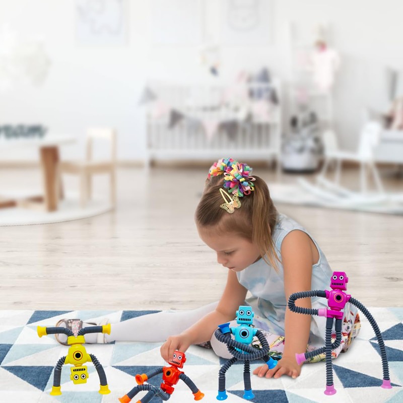 - 【Imaginative Creative Toys】Suction Cup Robot Toy are a fun and engaging sensory toy, When stretched, the tubes create a satisfying popping sound that stimulates the senses and provides a calming effect.The suction cup at the bottom allows it to be attached to smooth surfaces like mirrors, windows, and tiles. Children can enjoy sticking it in various places and watching the robot pose in various shapes,which is very beneficial for stimulating children's creative thinking.