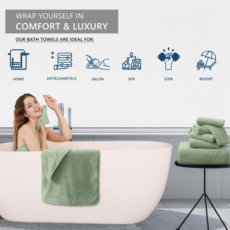 - MULTIPURPOSE TOWEL SET– Large bath towel sets can be used perfectly for various purposes including bathroom, hotel,beach,gyms,shower rooms,swimming pools, spas,hotels,salon, and as college dorm room essentials. These bathroom towels provide users with all the required bathroom drying needs either to dry your body or warp around your hair