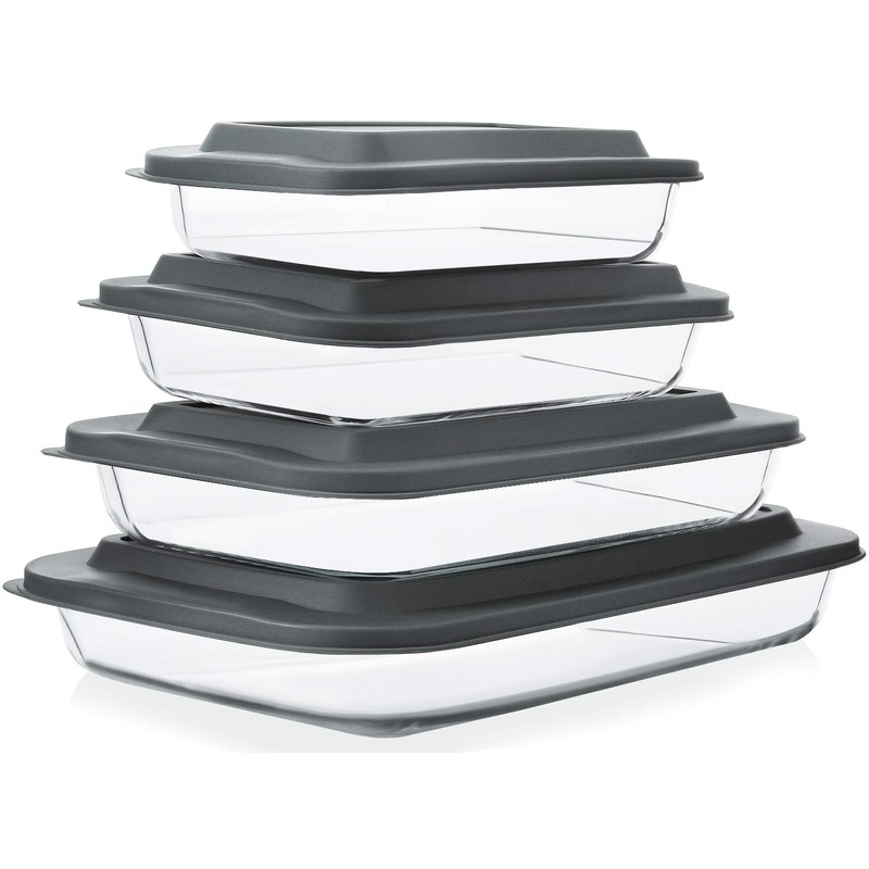 - TIGHT FITTING LIDS: 8-piece baking dishes set includes 4 baking dishes and 4 gray plastic tight fitting lids, which are designed to keep your food fresher longer. Made with a special non-slip design, you can stack these 4 containers with lids on top of each other in your fridge or freezer for space saving storage. Also they are sloshproof to prevent spilling while storing or on the go. The ideal set for baking, serving and storing food.