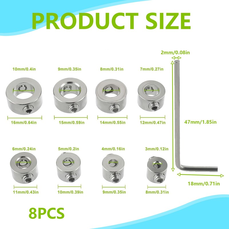 8 Piece Depth Stop Rings Set, 3-10 mm Stainless Steel Drilling Depth Limiter Positioner Ring Depth Stop Adjusting Rings with Hex Key for Woodworking Positioning Depth Limited Drill