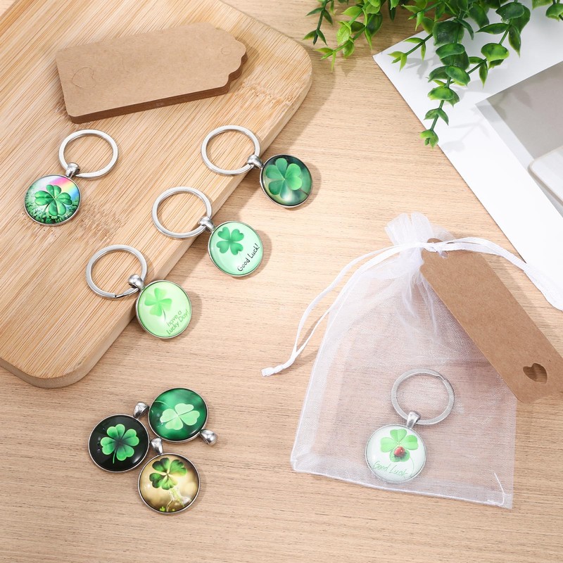- Lucky charm keyring set: our keyring set contains 8 lovingly designed pendants with four-leaf clover motif, 8 hanging tags and 8 organza bags. Each clover pendant has a pleasant size and can be used as a birthday party or small thank you. With different designs, this set brings happiness and joy for young and old