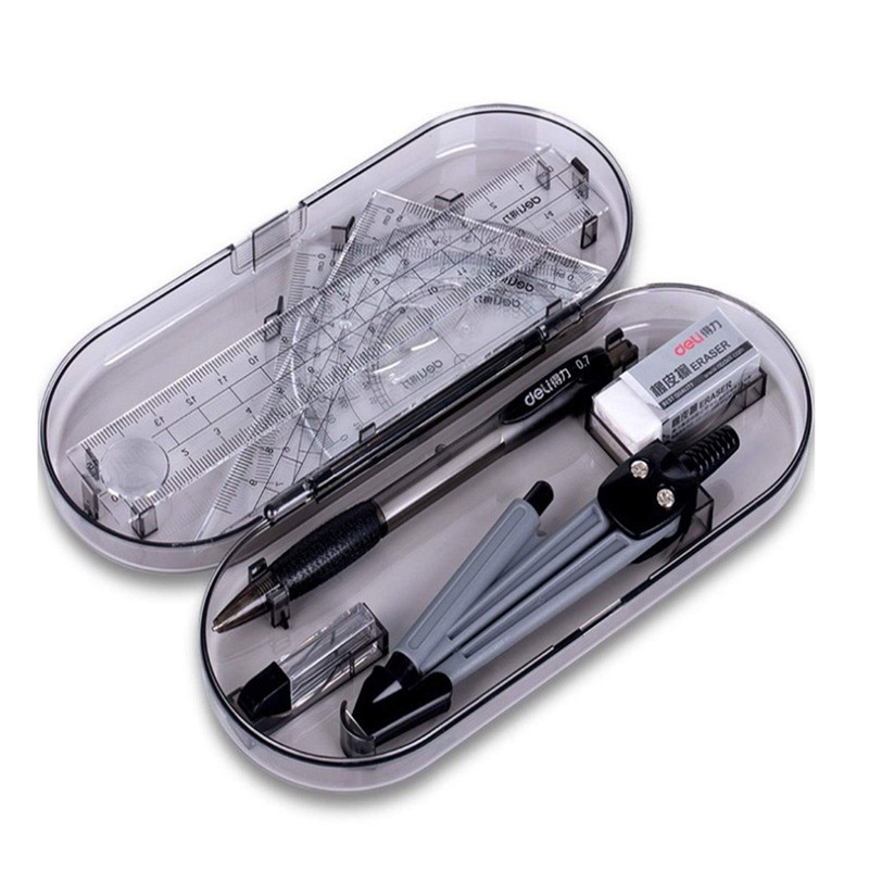 • A Variety of Learning Tools Our stationery box contains 8 different learning tools, 2 x graphic compass; 2 x triangle ruler; 1 x ruler; 1 x protractor; 1 x pencil; 1 x pencil refill; 1 x white eraser; 1 x sharpener; can meet different learning needs.