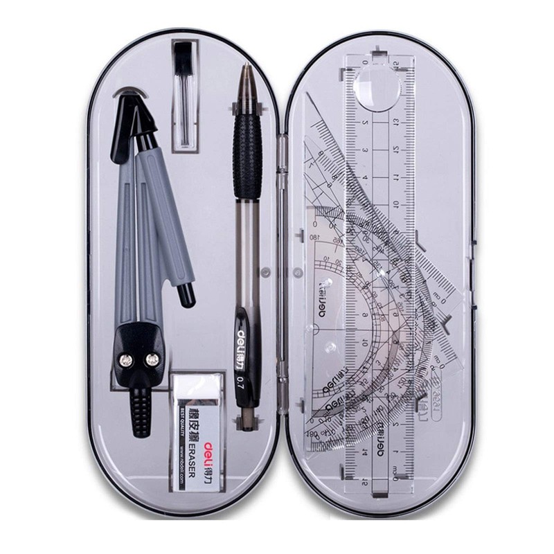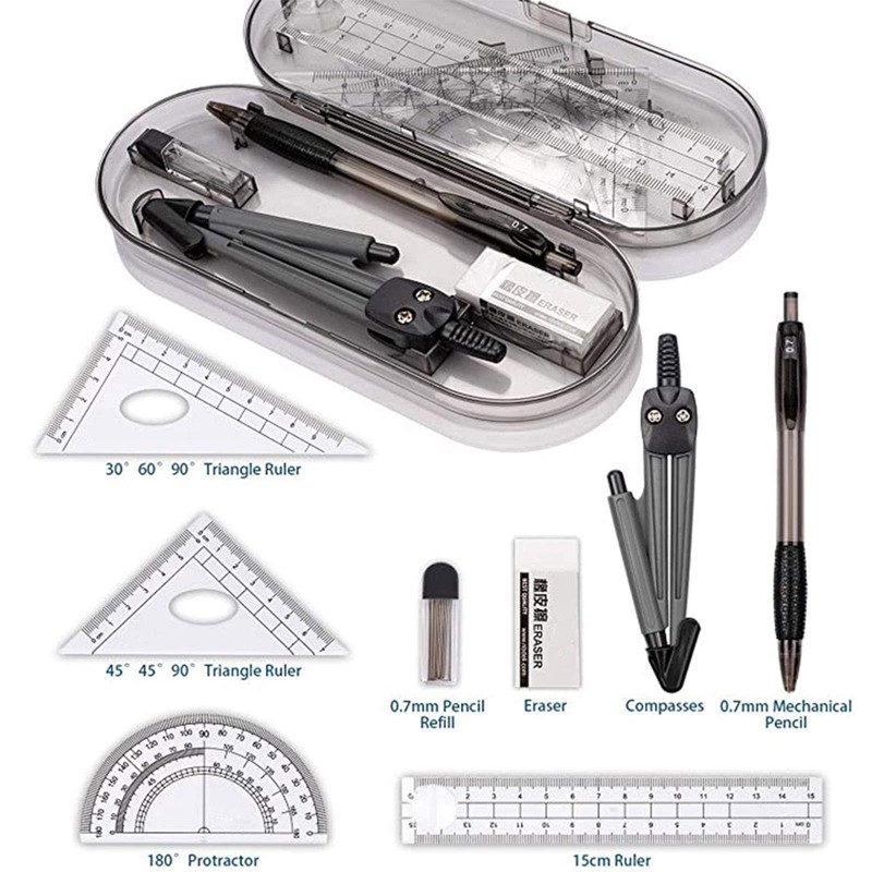 - A Variety of Learning Tools Our stationery box contains 8 different learning tools, 2 x graphic compass; 2 x triangle ruler; 1 x ruler; 1 x protractor; 1 x pencil; 1 x pencil refill; 1 x white eraser; 1 x sharpener; can meet different learning needs.