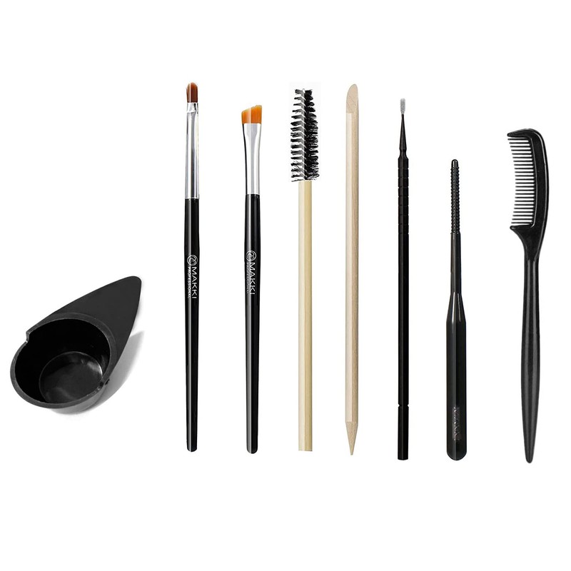 - 1 x Makki Flexi Applicator, 1 x Oblique Tip, 1 x Curved Tip, 1 x Bamboo Mascara Applicator, 1 x Microbrush Applicator, 1 x Orange Stick (Double Ended Wooden Stick), 1 x Plastic Stirring Tray and 8) Eyelash and Eyebrow Comb