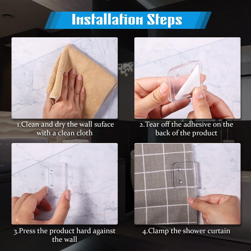 - Avoid Splash Design: tub corner splash guard is virtually invisible from outside the tub and shower, and shower curtain clips are able to securely hold the curtain to wall, which is good to reduce leaks and splashes when taking a bath, and avoid the embarrassment of shaking blown by wind