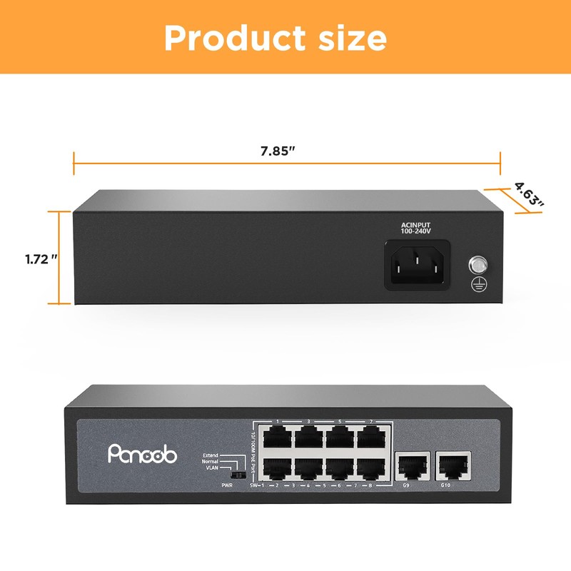8-Port 120W PoE Switch, 2 Gigabit Uplink Ports, 802.3af/at, Supports 4K/8MP/5MP IP Cameras, Metal Housing, Plug & Play, Lightning Protection, PA-POE08