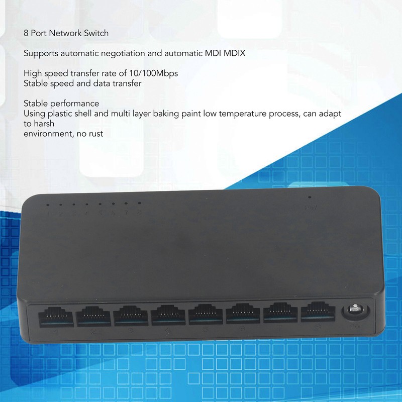 1、RELIABLE PERFORMANCE: With its sturdy plastic shell and multi layer baking paint low temperature process, this switch can adapt to harsh environment, no rust. 2、HIGH SPEED TRANSFER RATE: This switch offers a high speed transfer rate of 10/100Mbps, ensuring fast and seamless data transmission between devices. It is ideal for gaming, streaming, and file sharing. 3、MULTI FUNCTIONAL: The network switch supports automatic negotiation and auto MDI MDIX, providing stable speed for each device. It significantly extends your network capacity, enabling fast large file data transfer. 4、COMPACT DESIGN: With its compact and stylish design, this switch can fit easily into any space without taking up too much room. It is perfect for small offices or homes with limited space. 5、SIMPLE APPLICATION: The switch features a fanless design to ensure quiet operation at all times. Seamlessly integrating into your office environment, offering plug and play functionality.