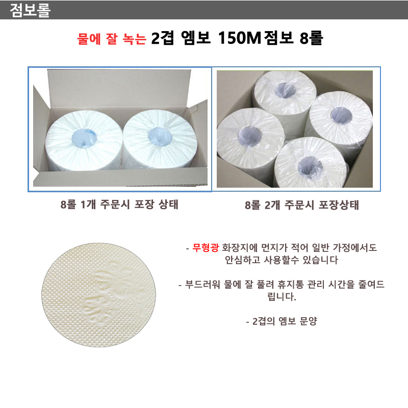 8 rolls of 2-ply embossed 150m jumbo, easily soluble in water / 물에 잘 녹는 2겹 엠보 150m 점보 8롤