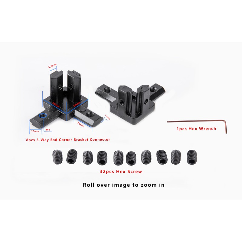 - Packaging: 8 three-way right angle connectors, 32 fixing screws, and 1 hex wrench for fixing the screws.