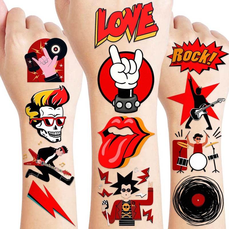 - ROCK N ROLL PARTY DECORATIONS: ROCK n roll tattoos temporary cover the total of tattoo stickers obtained the idea from the inspiration of music ROCK party that is the outstanding gift achieved for 50 years old to 90s including kids who have a special interest in this unique music genre. Thanks to vibrant black and red color covering temporary tattoos, children have no sadness at all replaced with charming in sound of ROCK music party^^