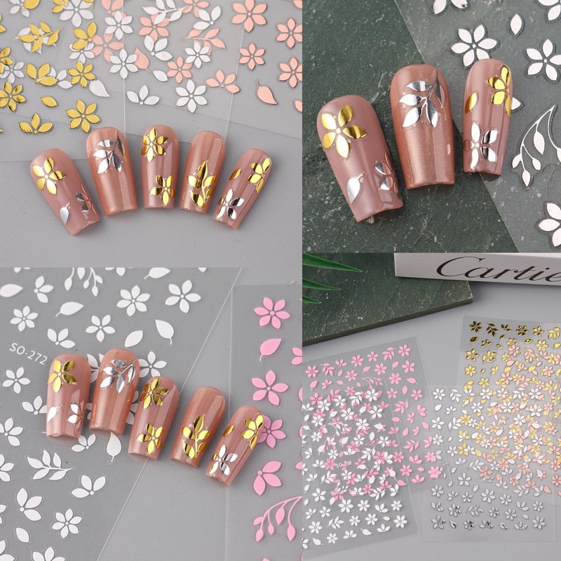 8 Sheets Flowers Leaf Nail Stickers for Nail Art 3D Self-Adhesive Flower Leaves Nails Design Gold Silver White Flowers Nail Decals Summer Manicure Decoration Supplies for Women DIY Charms