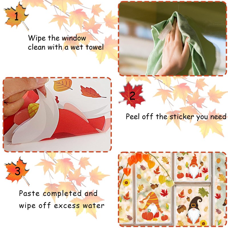 - Easy to use: our autumn leaves window stickers are suitable for both indoor and outdoor use. The Thanksgiving window stickers are equipped with a self-adhesive backing so you can easily and quickly apply the sheets to any smooth surface.