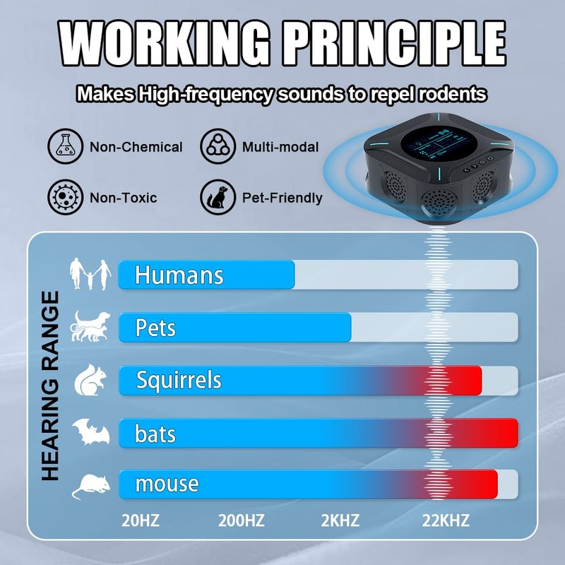 - đ«ăEFFECTIVE PROPERTY PROTECTIONăPlace the ultrasonic pest repeller in your house, attic, garage, basement, RV or barn; save your rodent control costs, prevent your property from being damaged by rats, effectively repel squirrels, mice, rats, bats and small animals, and keep your private space free from pests.