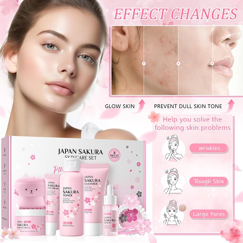 - 🌸【Sakura Gesichtspflege Set】 Enthält 1 Gesichtsreiniger, 1 Toner, 1 Essenz, 1 Augencreme, 1 Essenzcreme, 1 Haarnadel, 1 Haarseil und 1 rosa Oktopusbürste. Insgesamt acht Sets decken alle Schritte der Reinigung, Feuchtigkeitsversorgung, Reparatur und Pflege ab und sorgen so für ein professionelles Hautpflegeerlebnis.