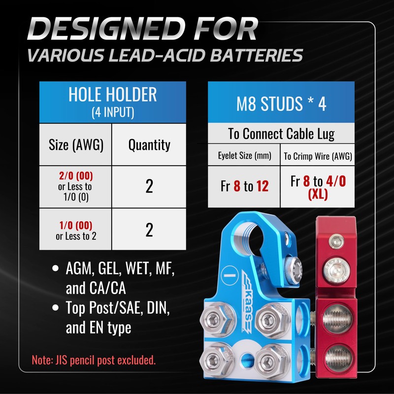 - Specifically designed for lead-acid batteries including AGM, GEL, WET, MF, and CA/CA, our battery terminal connectors are tailored to fit top post/SAE, DIN, and EN types. Note: JIS pencil post excluded.