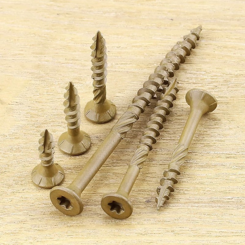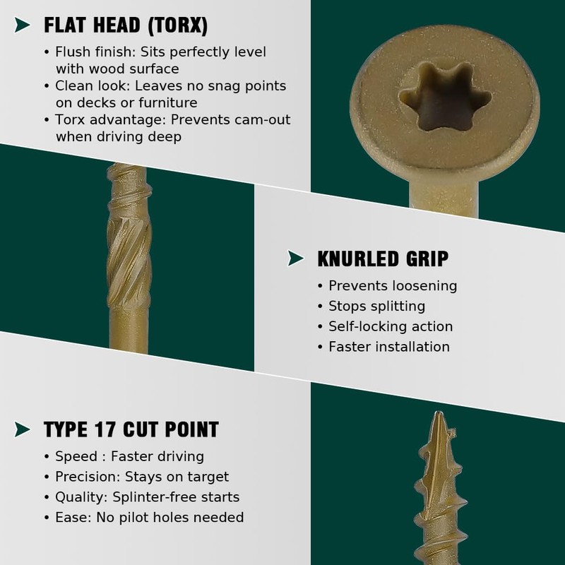 - Flat Head (Countersunk) Design: Sits perfectly level with wood surface; Leaves no snag points on decks or furniture; Torx T25 advantage: Prevents cam-out when driving deep