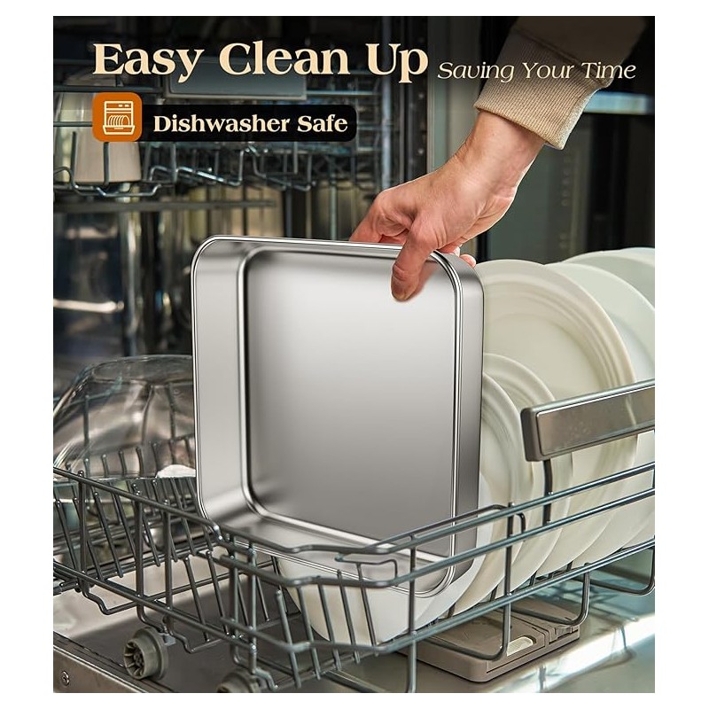 - Newly Upgraded 304 Stainless Steel Material: Our 8x8 baking pan is made of newly upgraded food grade 18/8 stainless steel material without aluminum or any toxic chemical substance, No worry about coating chip off or the toxic material leaching into your food, Superior to aluminum or nonstick pan. Premium and sturdy material not easy to break and deform, Rust proof square cake pan durable for year to come. Healthy for everyday home use and professional heavy production use.