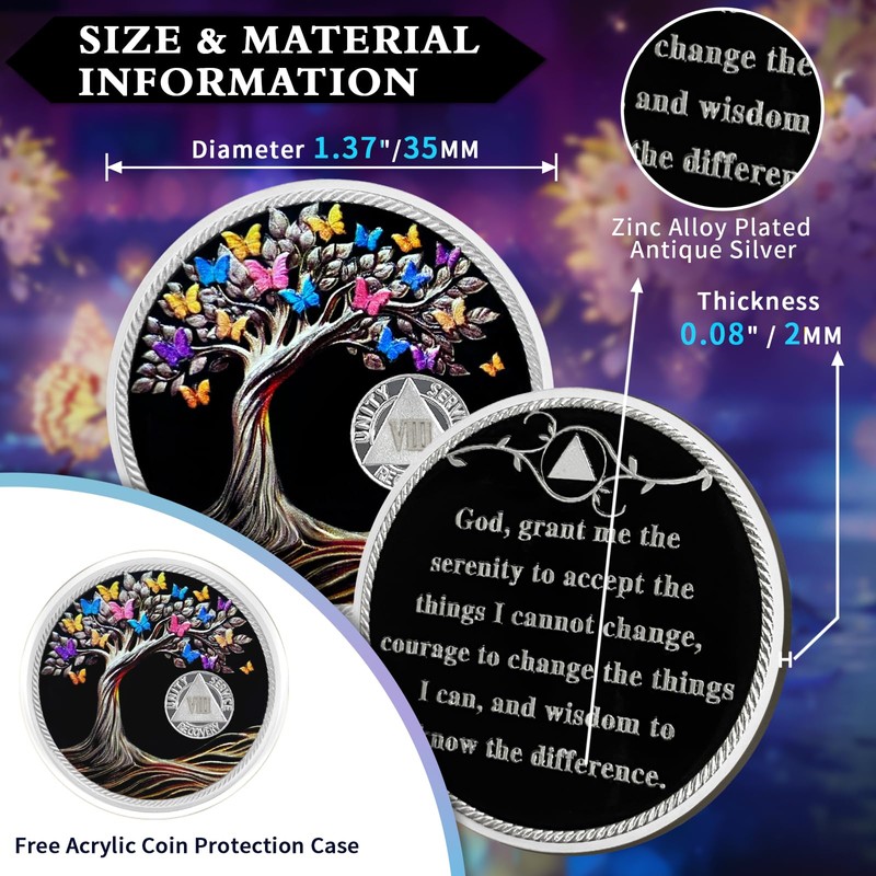 - More Options: There are 1-30 years Butterfly Tree of Life sobriety chips for you to choose as a sobriety coin. Each chip is meticulously crafted with unique 3D Hydraulic Process craftsmanship, serving as a powerful reminder and source of support for you or your loved ones on the journey to recovery. Perfect as a thoughtful sobriety gift for both men and women