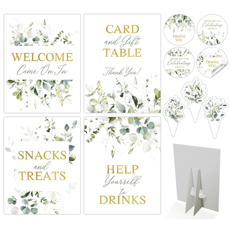 - Featuring 4 SELF-STANDING table signs: Welcome Come On In, Help Yourself To Drinks, Card and Gift Table Here, Snacks and Treats.