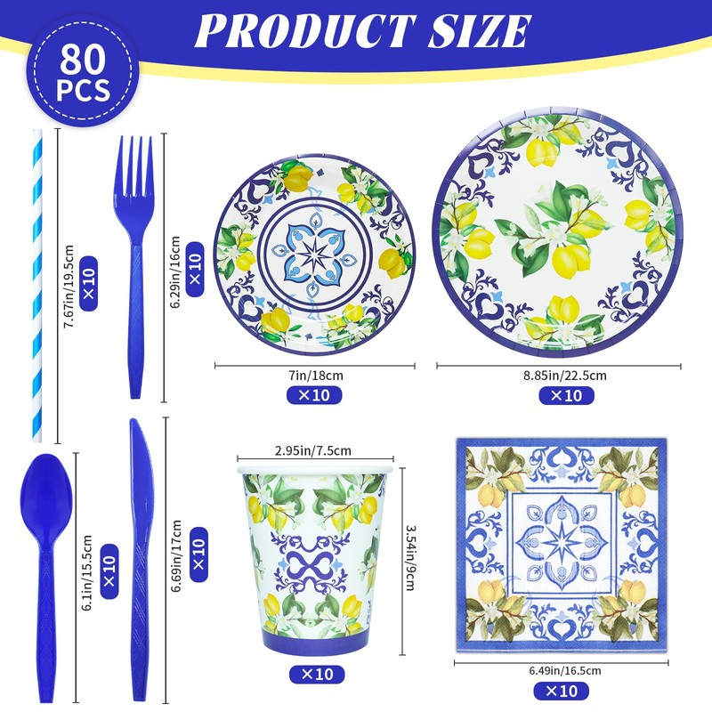 - 【Package Include】: You will receive 80pcs Lemon Party Supplies in blue color,including 10 pcs 9 inch dessert plates,10 pcs 7 inch dessert plates,10 pcs napkins,10 pcs knives,10 pcs forks,10 pcs spoons,10 pcs cups and 10 pcs straws,which can serve 10 guests