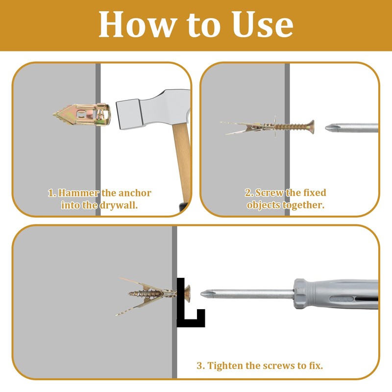- Convenient And Effortless Installation: no pre-drilling required—simply hammer the anchor into the wall, insert the screw, and tighten. The expanding design ensures a secure hold with minimal wall damage.