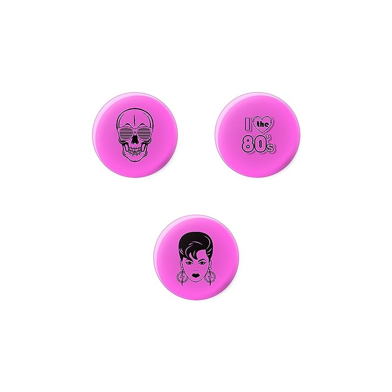 80's Skull Face with Sunglasses - I Love The 80s - 1980's Woman Small Mini Badges - Fluorescent Pink - UV Reactive Black Light Glow - Pin Button Badge - 3 Pack