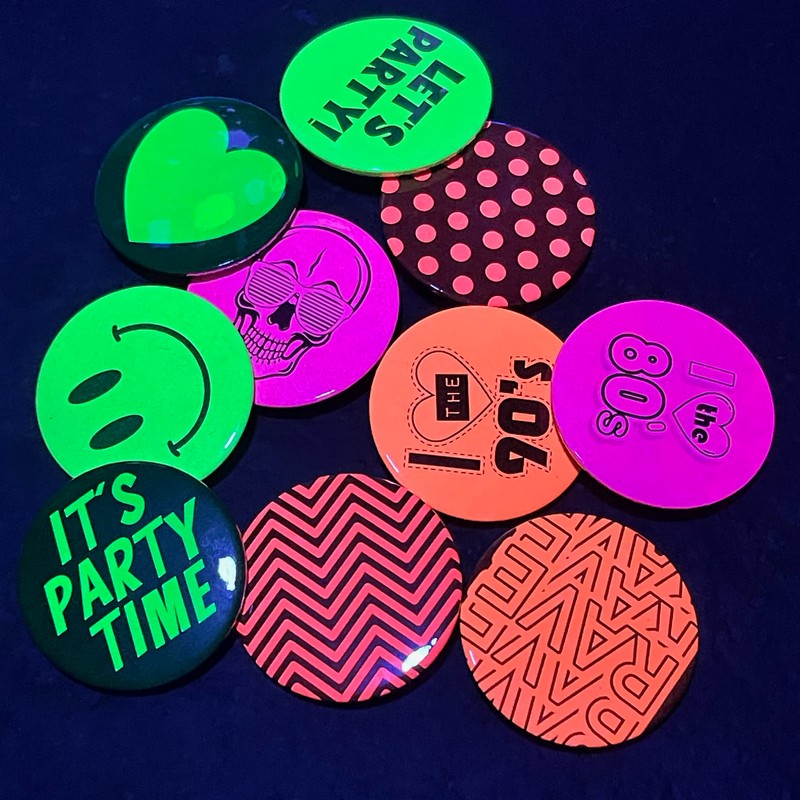 80's Skull Face with Sunglasses - I Love The 80s - 1980's Woman Small Mini Badges - Fluorescent Pink - UV Reactive Black Light Glow - Pin Button Badge - 3 Pack