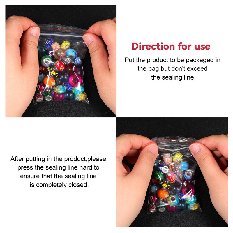 Each zip poly plastic bag is resealable, this feature allows you to use it for many times, and then the plastic is clear, this design helps you to see the items that you have put in clearly, when you want to find out the items, you can find out them quickly.