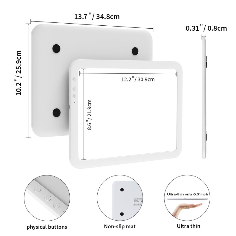 - 【8860Lux Super bright,6-Level/Stepless Adjustable Brightness】By briefly pressing the physical button you can select 6 brightness levels (2660/4100/5370/6615/7830/8860)Lux OR by long pressing the physical button you can adjust the brightness steplessly adjust(2660~8860)Lux.The maximum brightness of Drawing Lightbox reaches 10286Lux on the surface, which is a great tool for Drawing,art supplies,drawing supplies.