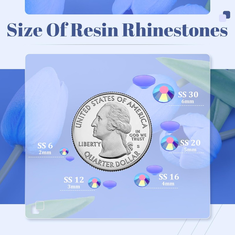 - 💎PACKAGE CONTENT -- The package contains approx. 8000 pcs of 3mm-SS12 (0.12") bling-out resin rhinestones (Dark Blue AB). The large amount will support you to fulfill a number of your wonderful DIY decoration ideas. Additionally, 1 tweezers and 1 pickup pen are included for easily picking up of glittering gems.