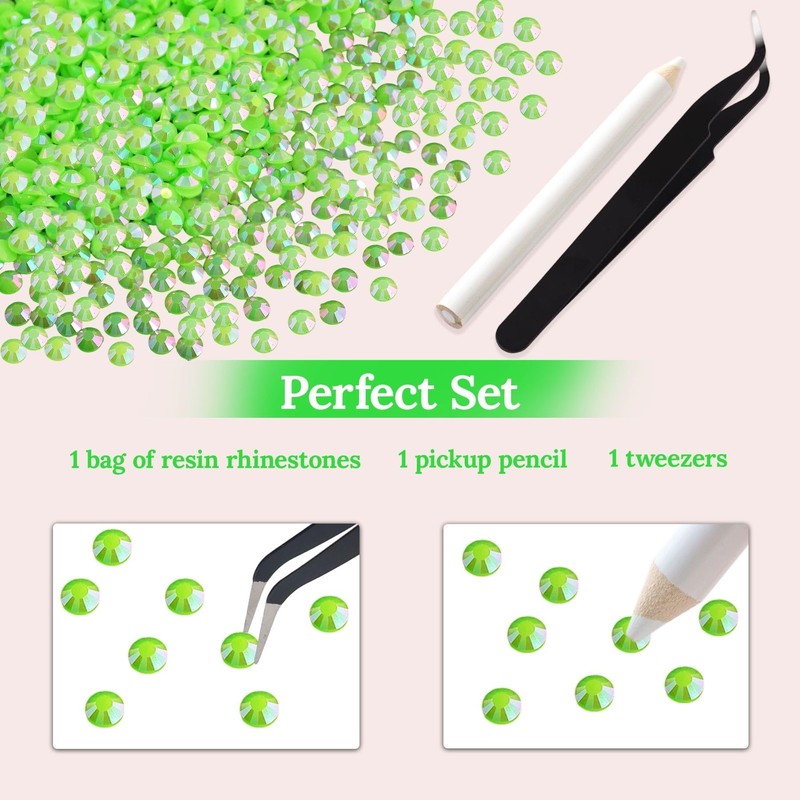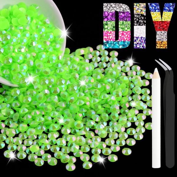 - 【Package Content】This bulk pack includes 8000 pcs of 4mm-SS16 (0.16") Fluorescent green AB resin jelly rhinestones, plus 1 tweezers and 1 pickup pen for easy handling of the flat back gems. The ample quantity covers all your basic crafting and bedazzling needs