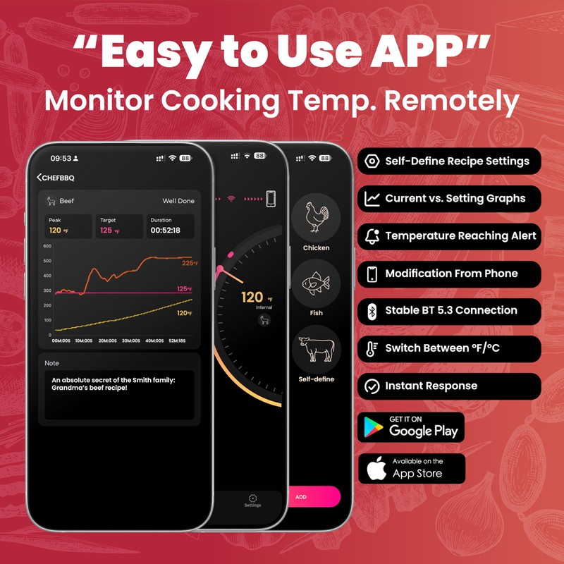 - Smart Meat Thermometer with Host Display and App-Controlled Cooking: Experience seamless temperature monitoring with our digital meat thermometer which offers both a host display and app control for iOS (version 12.2.0+) and Android (version 8.0+) devices. The app's guided cooking system leads you through each stage, ensuring perfect results. Custom alerts and notifications keep you on track, while the algorithm predicts ideal cooking times, simplifying meal planning and allowing you to enjoy stress-free cooking
