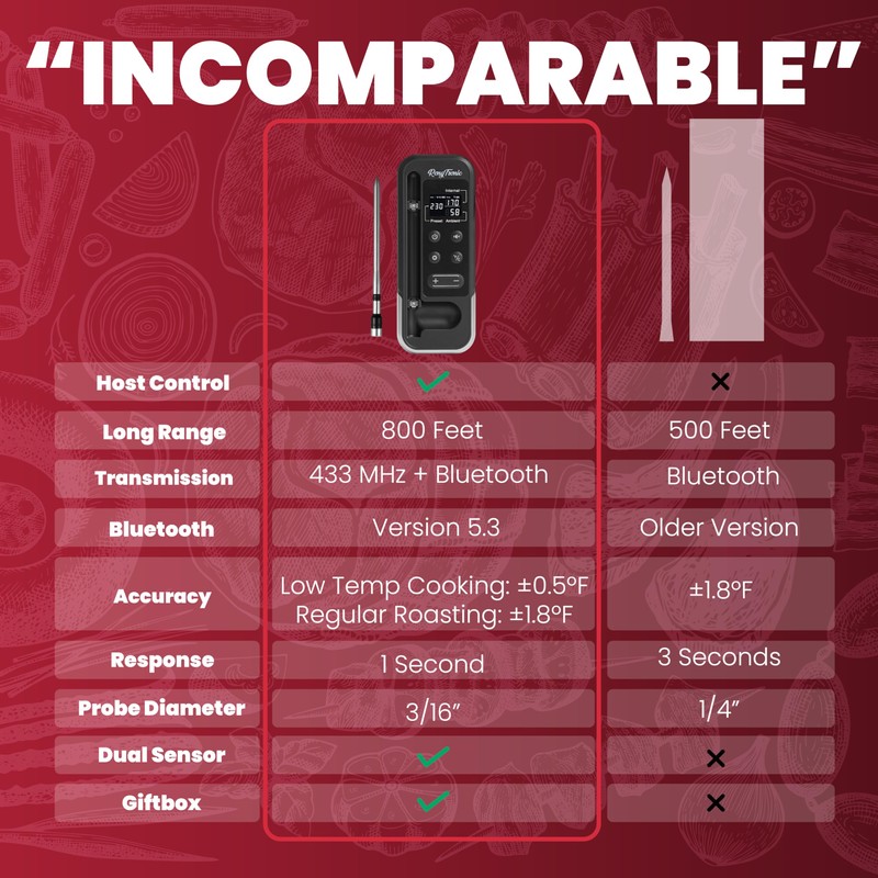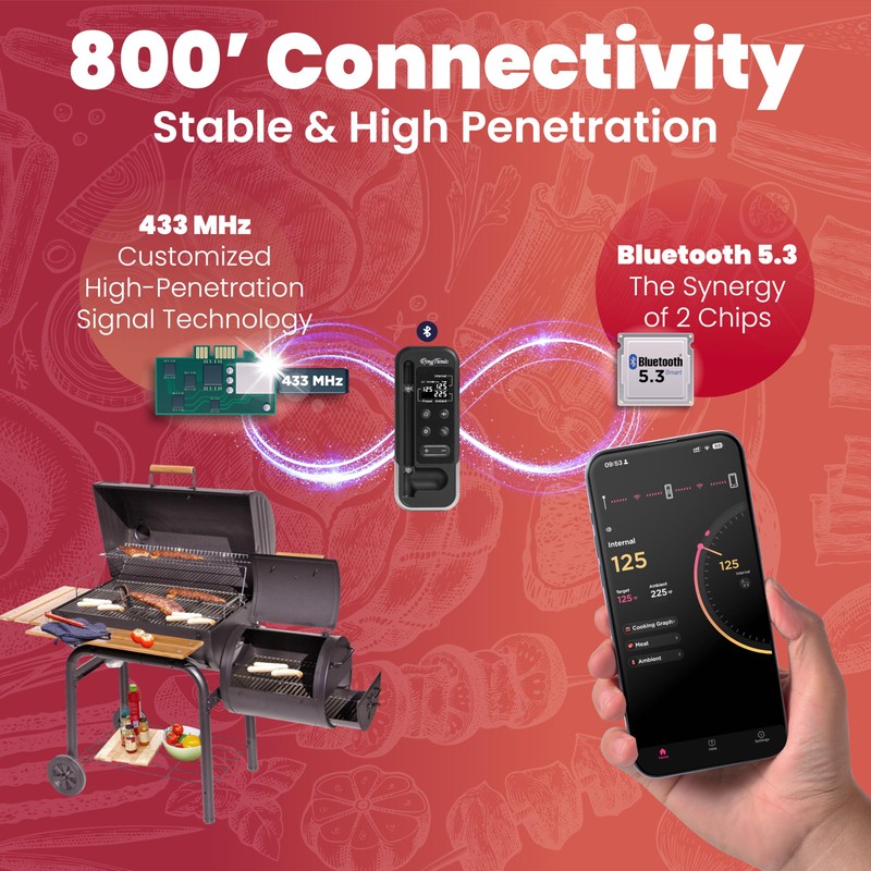 - 100% Wireless Meat Thermometer with 800ft Range: Enjoy true wireless freedom with our meat thermometer, featuring a max 800ft/ 243m range and typical 250ft/ 79m range. Monitor temperatures seamlessly through Bluetooth 5.3, no wires needed. This advanced monitoring system allows for easy multitasking, ensuring you never miss the perfect cooking moment, whether you're entertaining guests or handling multiple dishes