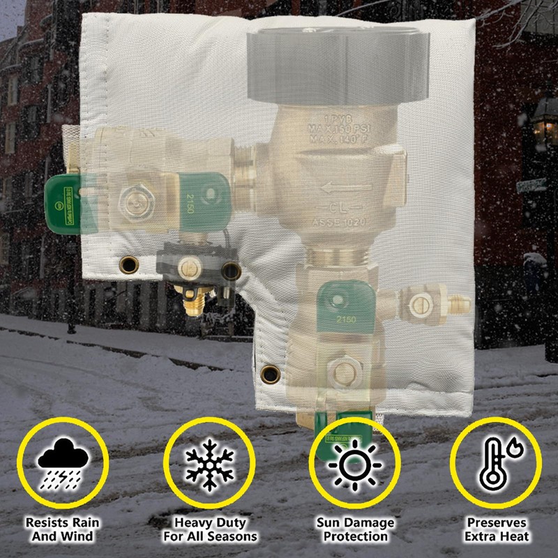 - The back flow preventer covers insulation product has dimensions of 12"W × 13"H and has a certain thickness. it is well suited for use with the 800M4 series valves. it is still recommended to measure your valve before making a purchase and ensure that you have a clearance of at least 1.5 inches. This will help ensure the proper fit and functionality of the backflow preventer insulation cover.