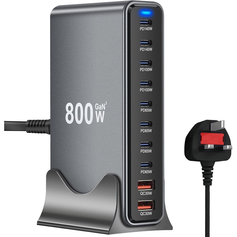 - 10-Port Multi-Charger --8 USB-C + 2 USB-A ports intelligently distribute a total power of up to 800W: USB-C 1-2: 140W PD3.1 (Ultra mode for a single laptop) | USB-C 3-4: 100W PD3.0 | USB-C 5-8: 65W PD3.0 | USB-A: 30W QC3.0