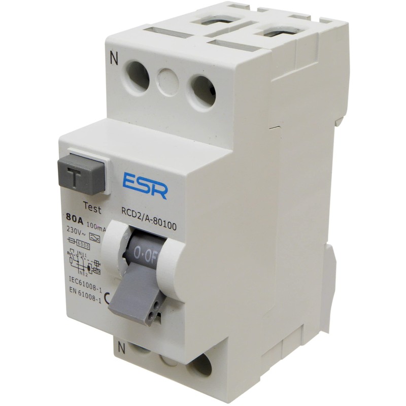 80A 100mA RCD Circuit Breaker, Type-A, 2 Pole, 230V, DIN Rail Mount, 80 Amp Residual Current Device Trip