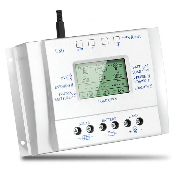 - 80A solar charge controller for 12V/24V DC input, simple visible LCD display for data display and monitoring of system status;