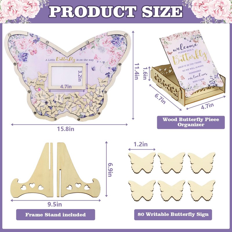 - [Butterfly Picture Frame]:Our baby shower sign in guest book is designed in an exquisite butterfly shape, adorned with beautiful butterfly and floral patterns, making it effortlessly blend in with various party decorations. Guests can write their names on the butterfly and then put it in to see where it lands. The butterfly sign in the guest book is simple to place for guests and pleasing to the eye