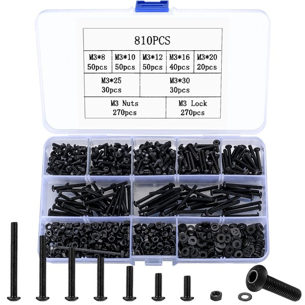 810 Piece M3 Screws Set, Allen Screws Nuts Set, Pan Head Hex Screws with Nuts and Washers Set, Threaded Screws Bicycle Machine Screws Assortment Set (M3)