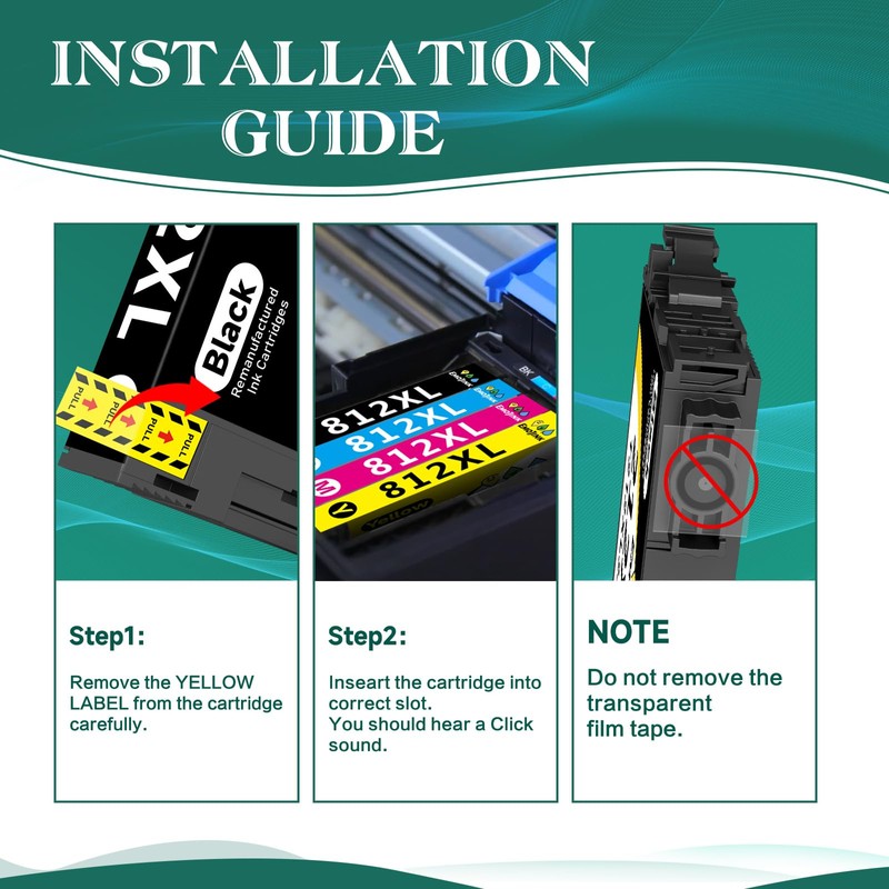 - Package Contains : Remanufactured 812xl t812 t812xl for epson 812 ink 4 Pack Combo Set.Includes 1 x Cyan, 1 x Magenta, 1 x Yellow, 1 x Black,1 x User Guide,1 x Disposable Gloves.