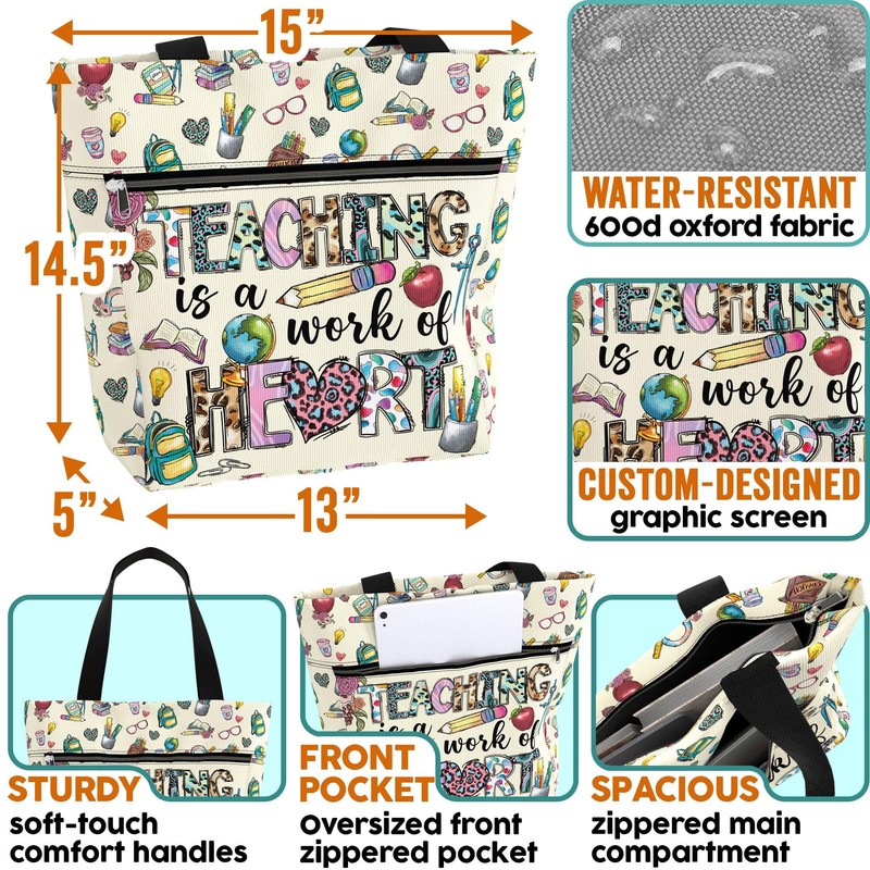 84hoods Aesthetic Tote Bag for Women Gift for Teacher. Cute Graphic Large Shoulder Bag 15 inch with Pockets and Zipper for Work. Waterproof Grocery Bag Teaching is Work of Heart.