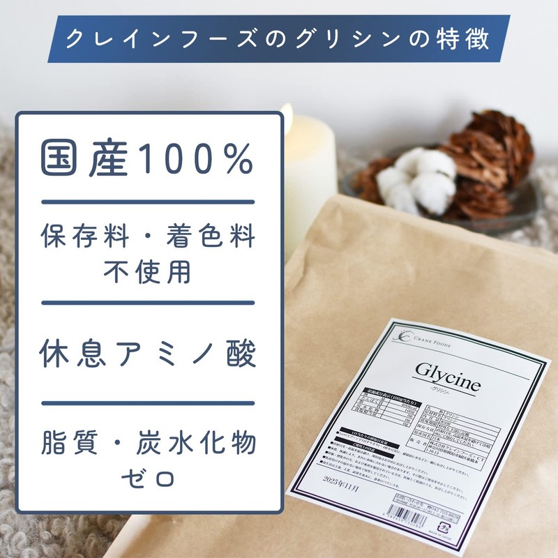 - 【グリシンとは?】普段食べている食品(ホタテ・エビ・カニ・鶏肉・豚肉・牛肉など)にも含まれる成分です。また、皮膚やたんぱく質であるコラーゲンの約35%を構成している成分でもあります。お休み30分前に約3gを摂取することを推奨しています。