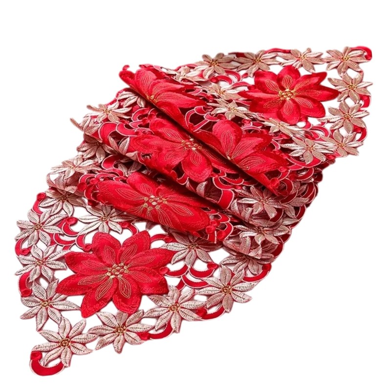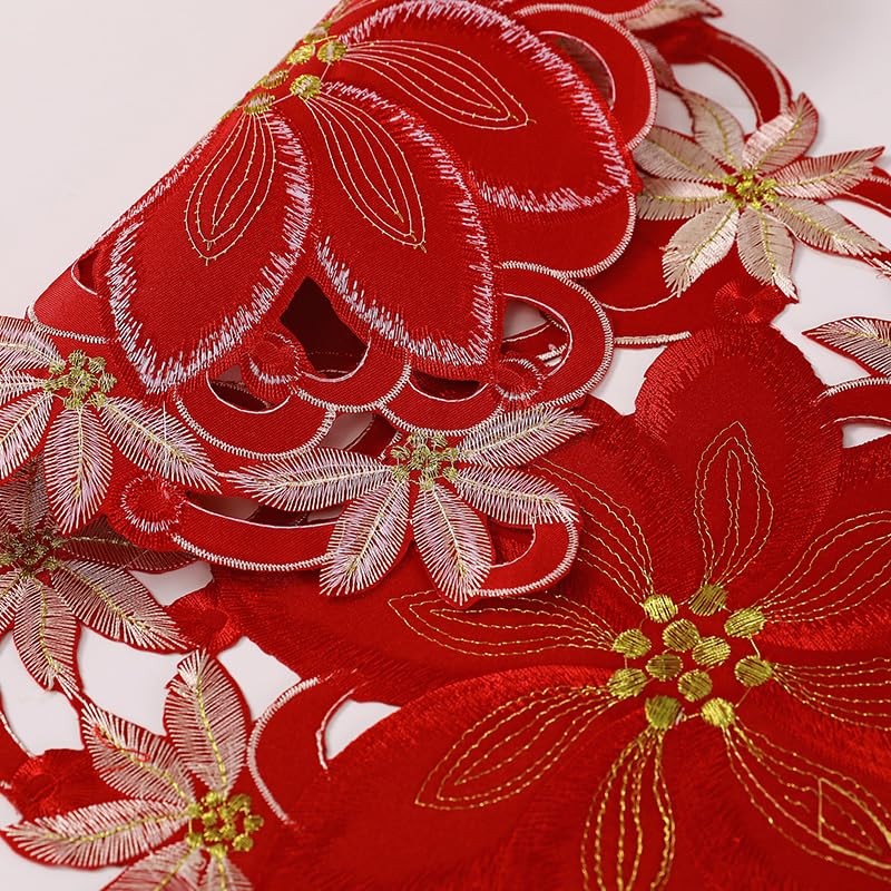 86" (220cm) Length Extra-Large Christmas Table Runner - Elegant Mistletoe and Poinsettia Cutwork Embroidery for Grand Holiday Gatherings (Red&Gold, 1pc- Table Runner)