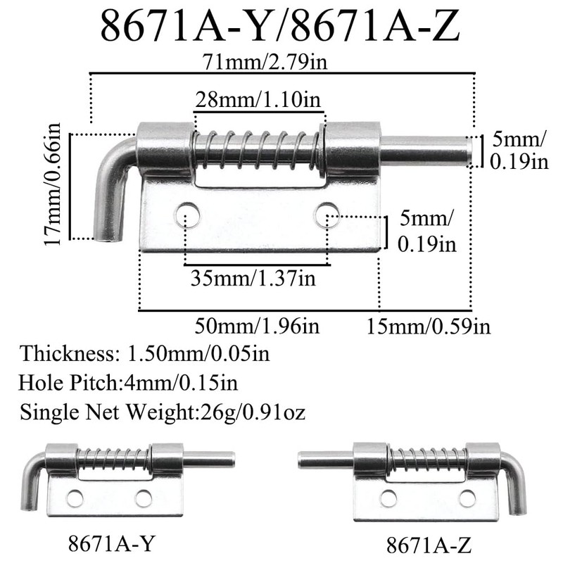 - Various Models The 304 stainless steel flat pin hinge spring lock has 14 kinds of specifications and models for you to choose to meet your needs. You can find the right latch for you depending on the size of the latch that fits the power box in your house