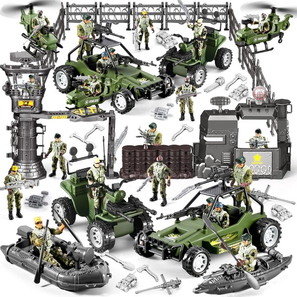 - 88-in-1 Army Men Boy Toys Large Playset Includes: 1 Jumbo Military Base/1 Military Truck/1 Airplane/1 Helicopter/2 Kayak Boat/1 Motorcycle/6 Army Men Action Figures/75 Weapon Gears.