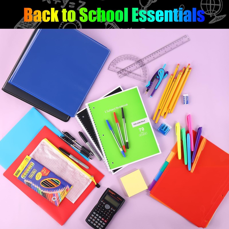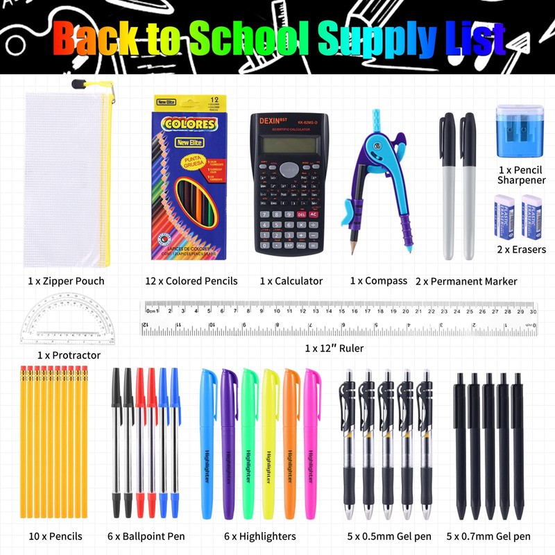 - Value Pack: Contains 1 Backpack, 2 Ring Binders, 2 Folders with Pockets, 2x6-Tab Plastic Dividers, 2 Subject Notebooks, 2 Composition Books, 1 Subject Notebook, 1 Zipper Pouch, 12 Colored Pencils, 1 Calculator, 1Pencil Sharpener, 2 Erasers, 1 Compass, 2 Permanent Marker, 1 Ruler, 1 Protractor, 10 Pencils, 6 Ballpoint Pens, 6 Highlighters, 5x0.5mm Gel Pen, 5x0.7mm Gel Pen