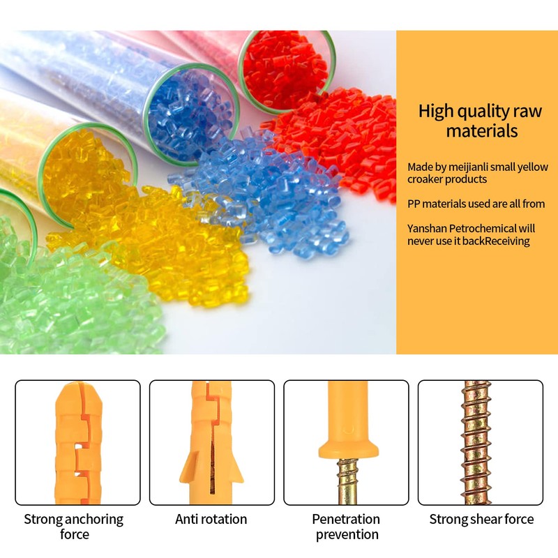 - Practical Design: Expansion pipe wall plug adopts expansion curve design, which greatly enhances the anchoring force. And the leaf-shaped protruding designs on both sides of the pipe sleeve, which can effectively prevent the expansion pipe from rotating when the screw is tightened, and at the same time increase friction.