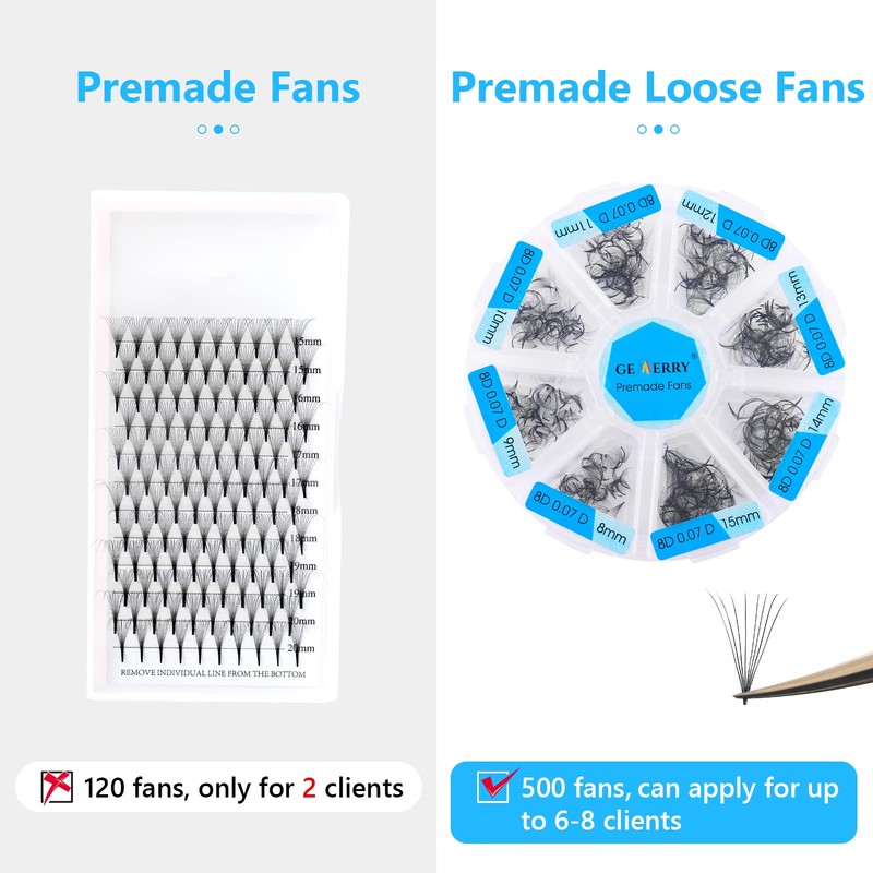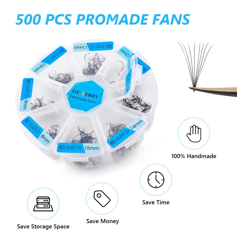 💖[500PCS-Budget-friendly Choice]: Our loose promade fans come in packages of 500 fans(+-2%) , 4.2 times the amount of other 12 rows premade lash fans trays, only 4 cents per fan.GEMERRY promade fans are the most budget-friendly solution.