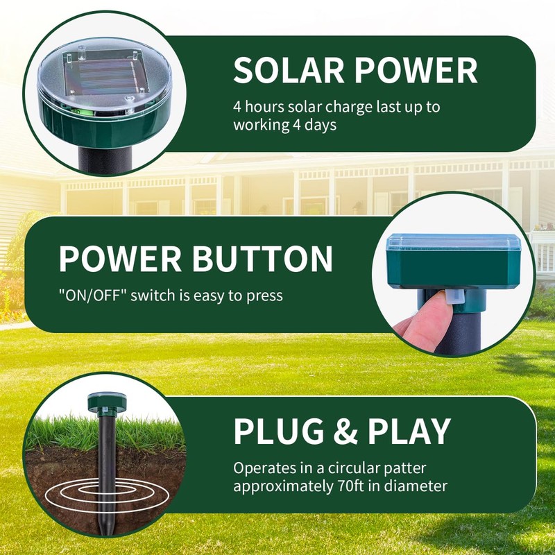 • SOLAR POWERED- The mole repellent is operated by a solar rechargeable battery. 4 hours of charge of solar mole repellent Ultrasonic in sunlight will be enough to keep them working for 4 days. Mole repellent stakes emit 3-4 seconds of low-frequency pulses every 20 seconds. *NOTE: Keep solar pest repeller stakes under the sun to charge for at least 2 days before installation.