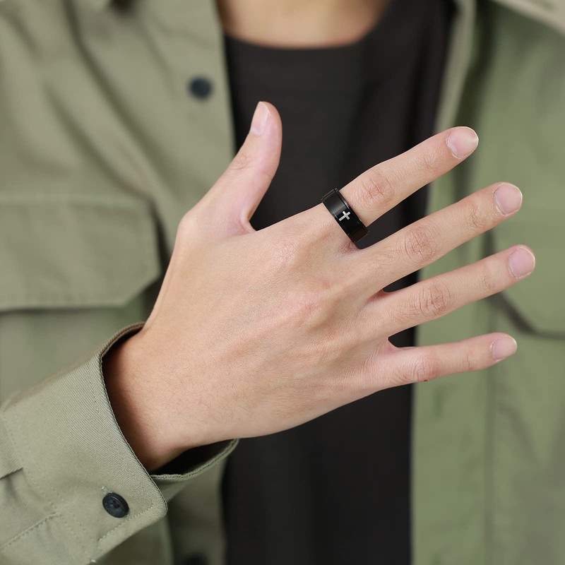 - ❤【MATERIAL&SIZE】Material: Black Plated Stainless Steel Engraved a Simple Cross. Engraved a Simple Cross. Ring Width: 8mm. Ring Size: 7 # ; Diameter:0.68 inch ; Circumference:2.15 inch